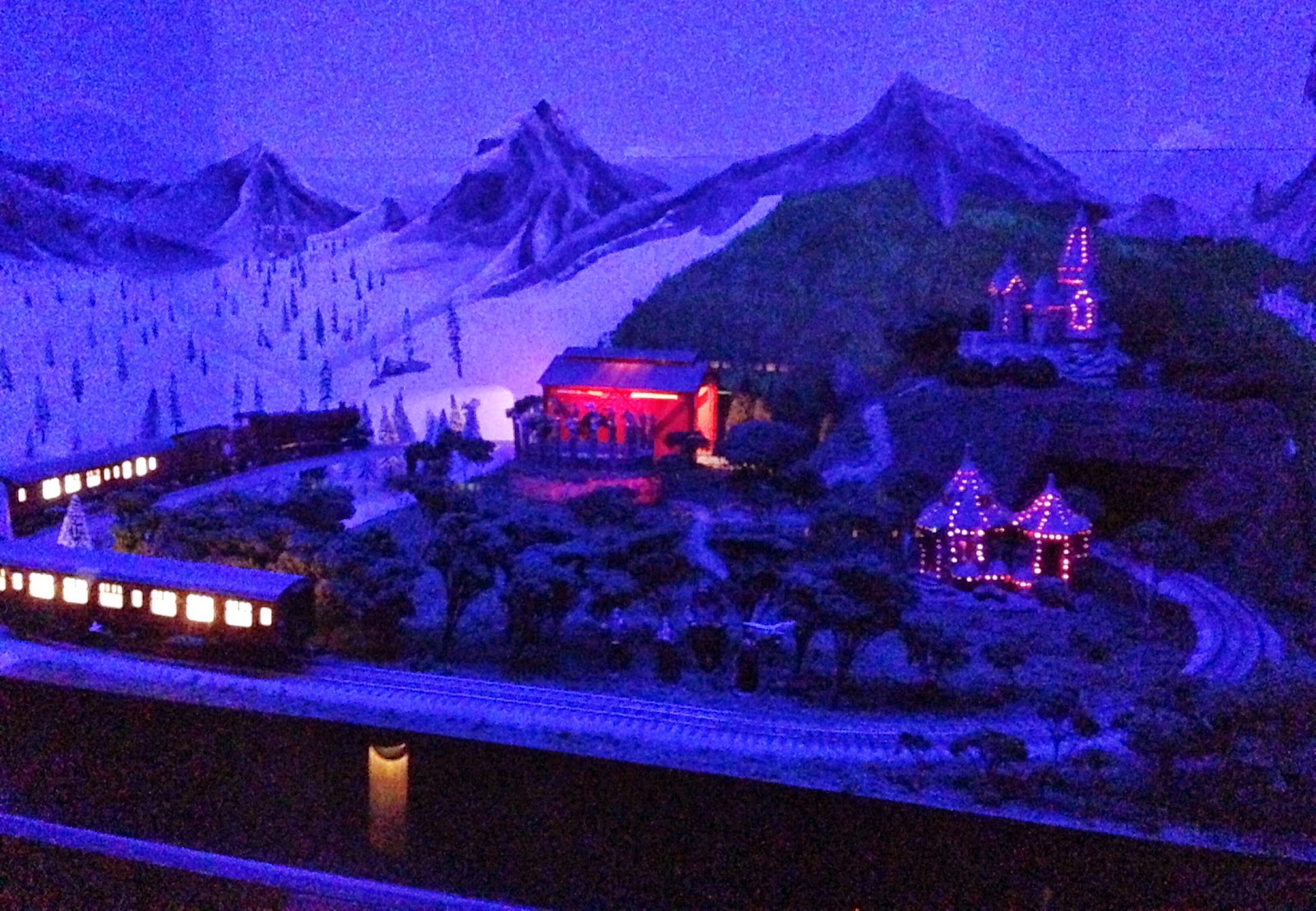 The fake storefronts are entrances to private rooms where you can book a party, and in the middle is a huge multi-model train display. They also have smaller displays set up in another area that are themed, like the Hogwarts version above.