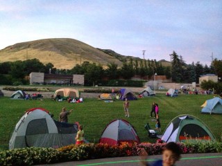 The amphitheater lawn area is reserved for the tents, and the programming during the evening includes s’mores, guided hikes, and music and movies. One year they even had telescopes set up to look at planets. Everyone sleeps using their own gear, and then in the morning they provide a catered hot breakfast.