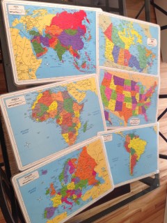 We used to keep them in the playroom as reference materials but started actually using them as placemats when we eat. I love the conversations that start out with just random observations about a place on a placemat.